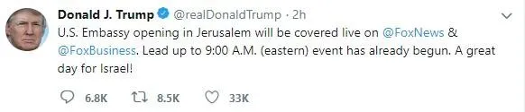 Trump, ABD'nin Kudüs Büyükelçiliğinin açılışının yapılmasına saatler kala Twitter'dan yaptığı açıklamada, "İsrail için büyük gün" dedi.