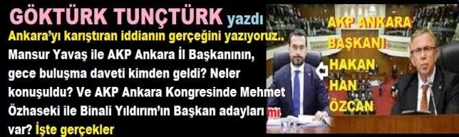 AKP İl Başkanı Hakan Han Özcan, Mansur Yavaş ile gizlice Beysukent’te bir işadamının villasında görüşmüş ve o iş adamı sanki yeni Ankara il başkanı olacakmış gibi pazarlanmış ve Büyükşehir Belediyesinden de iş alma konusunda da anlaşıldığı gibi, Mansur Yavaş’ı rahatsız etmeyecek yeni bir il yönetimi oluşturulacakmış..